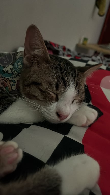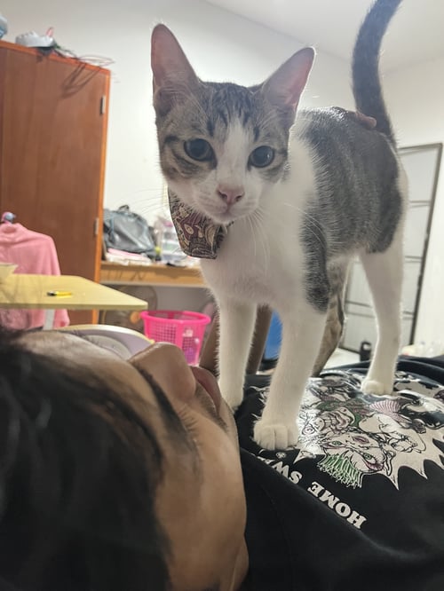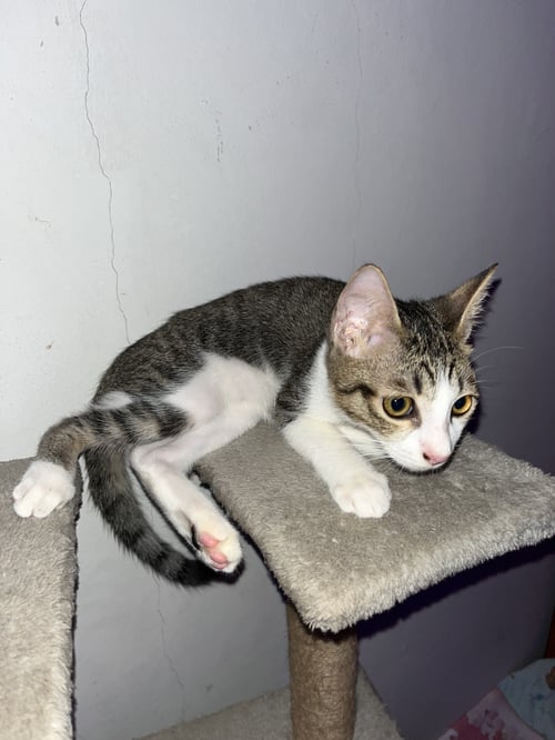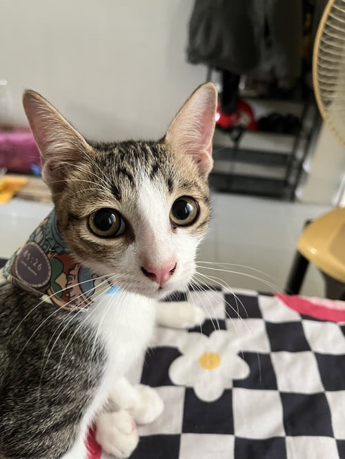 รอยตำหนิ: ที่ขาหลังข้างขวา ลายสลิดข้างเดียวมีปอกคอ น้องขี้กลัว ไม่ชอบให้ใครจับ