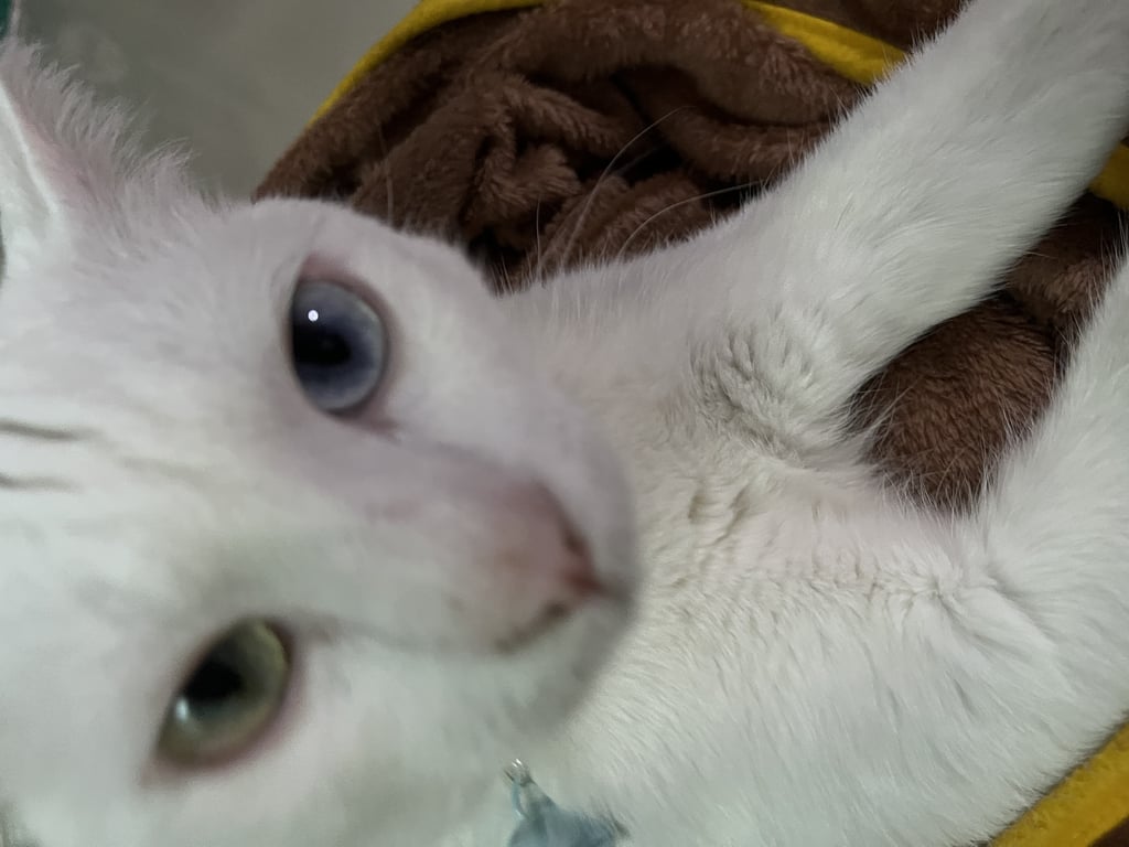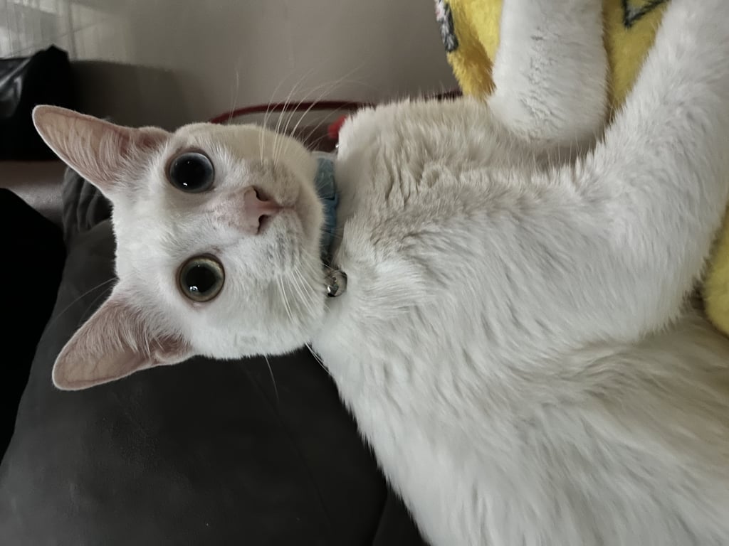 รอยตำหนิ: ตาขวาของฝั่งแมวจะเป็นสีเหลือง ตาซ้ายเป็นสีฟ้าใส หางยาวหยัก ขนปลายหางจะดูแตกๆ ถ้าลูบข้อกระดูกปลายหางจะคดๆ คล้ายหางปิกาจู ขนช่วงปลายหางจะกุดเพราะชอบกัดหางตัวเองตัวหนักประมาณ 5 กิโลกว่า ชอบร้องเสียงดัง พูดเก่ง ชอบนอนบิดตัวยืดตัวไปมาถ้าสบายใจ ถ้าจะอุ้มน้องจะไม่เกร็งตัวจะปล่อยตัวไหลทิ้งน้ำหนักทั้งตัวทั้งคอไปเลย ชอบวิ่งเล่น ชอบเอาเท้ามาตะปบที่หน้า