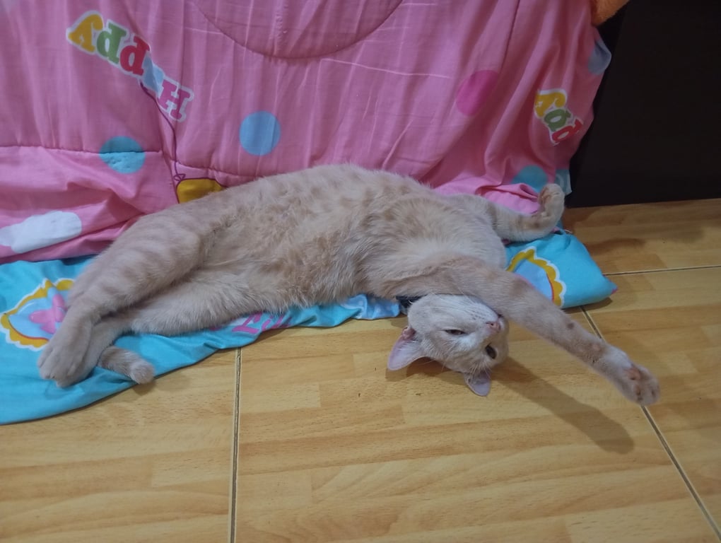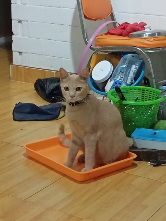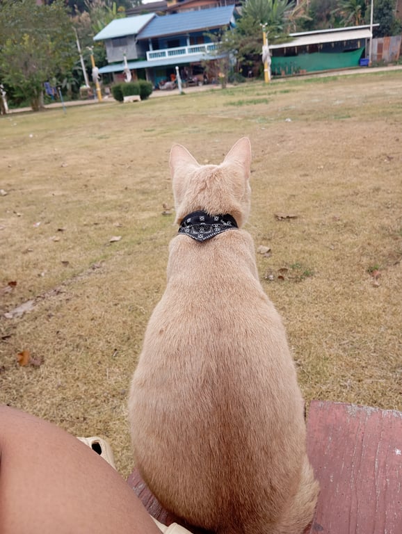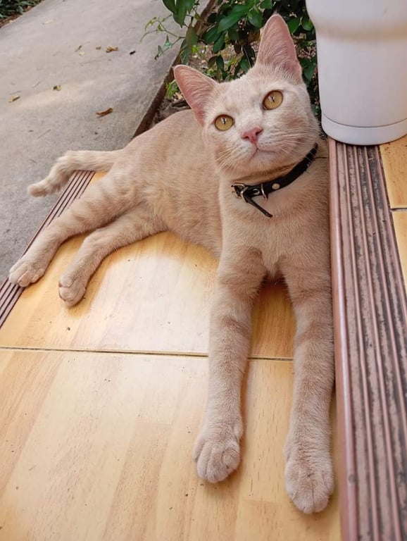 รอยตำหนิ: มีรอยขีดขนหายเป็นรอยเส้นตรงที่หลังคอใส่ปลอกคอผ้าพันคอสีดำไม่มีกระดิ่ง เป็นแมวอ้วน ขี้อ้วน หางยาว กินง่าย