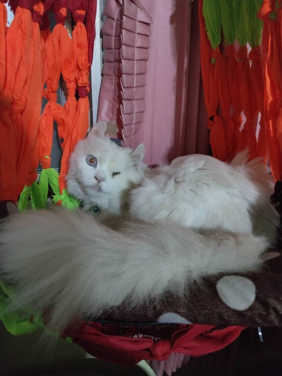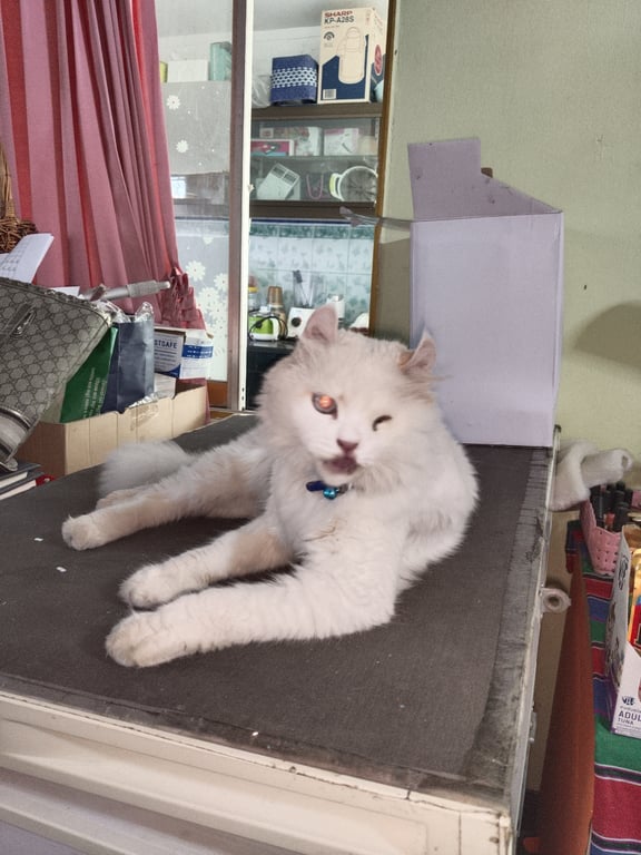 รอยตำหนิ: ตาบอดข้างซ้ายเเละมีเขี้ยวล่างยื่นออกมาขี้กลัวเเละไม่ค่อยร้อง