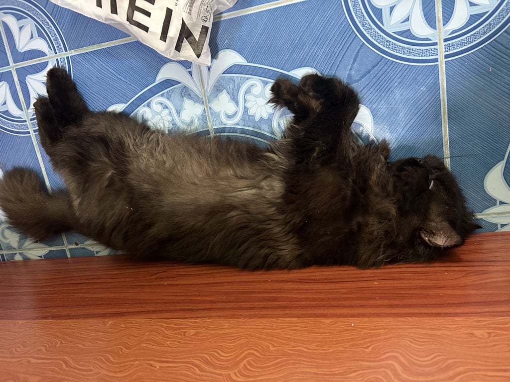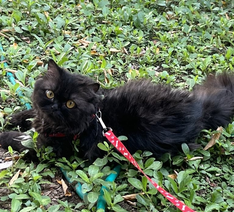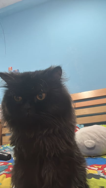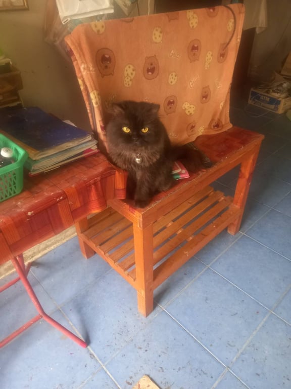 รอยตำหนิ: หางหักปลายเล็กน้อยเป็นแมวสีดำพันธุ์เปอเซีย ตาสีเหลืองส้ม ไม่สวมปลอกคอ นิสัยเป็นแมวขี้กลัว ขี้ตกใจ ชอบมุดแอบ นอนที่แคบ