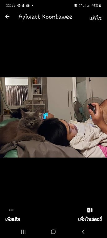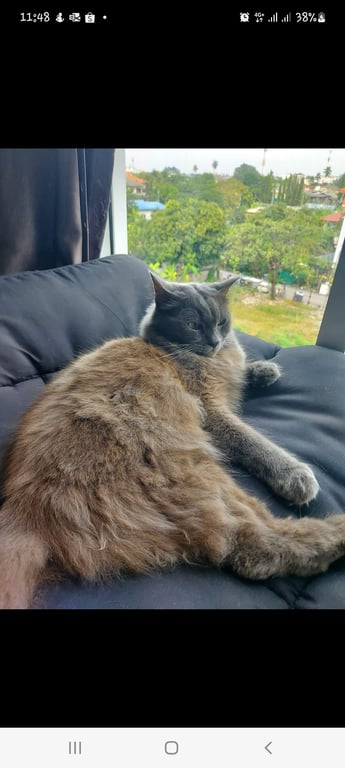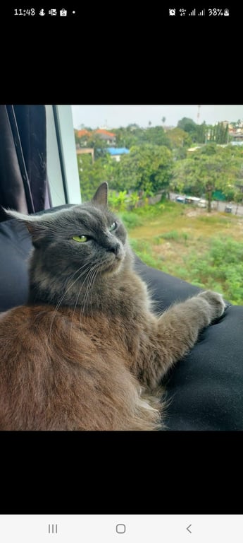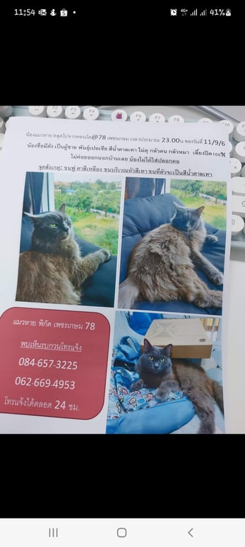 รอยตำหนิ: ตาสีเหลือง ขนฟู ช่วงหัวขนสีเทา ช่วงตัวสีเทาออกแดงๆน้องติดคน แต่ขี้กลัว ไม่ชอบน้ำ อาบน้ำแล้วจะป่วย อ้วกเพราะเครียด ไม่กลัวหมาเพราะเลี้ยงมากับหมา นิสัยขี้อ้อน ไม่มีประวัติตีกันกะแมวอื่น หรือข่วนกัดคน