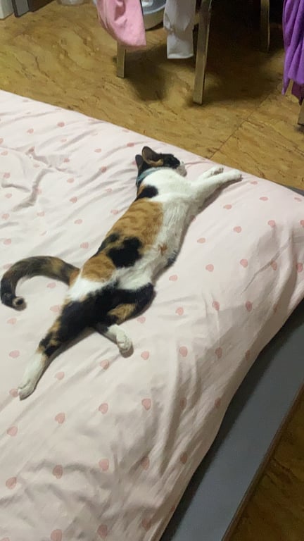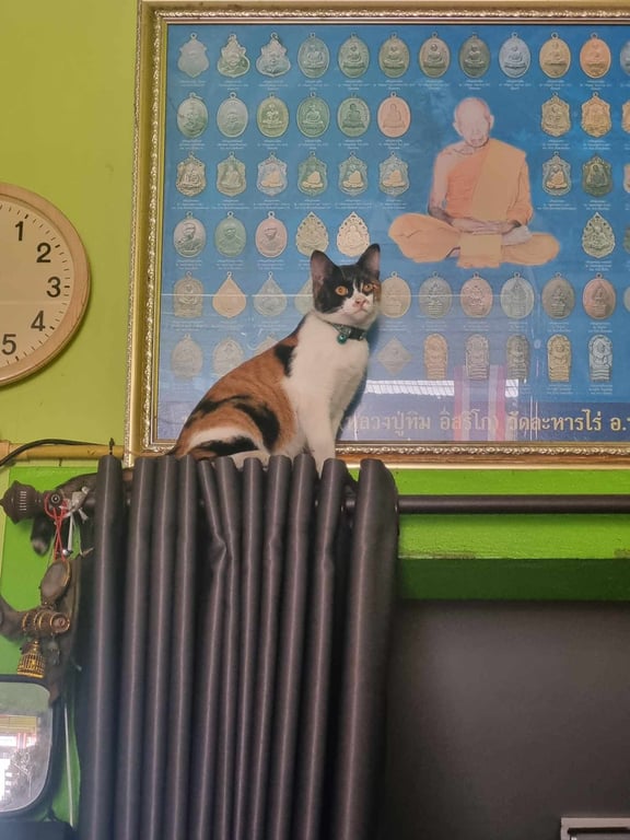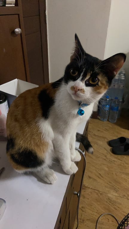 รอยตำหนิ: หนวดยาว จมูกชมพู อุ้งเท้าชมพูแมวสามสี ช่วงตาขนจะเป็นสีดำ นิสัยขี้อ้อน ชอบมาล้มใส่เท้า เชินเดินวนพันรอบขา หนวดยาวมากๆ ตัวค่อนข้างมอมแมมเพราะออกเที่ยวบ่อย