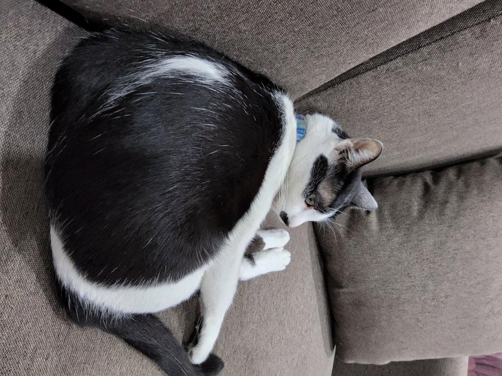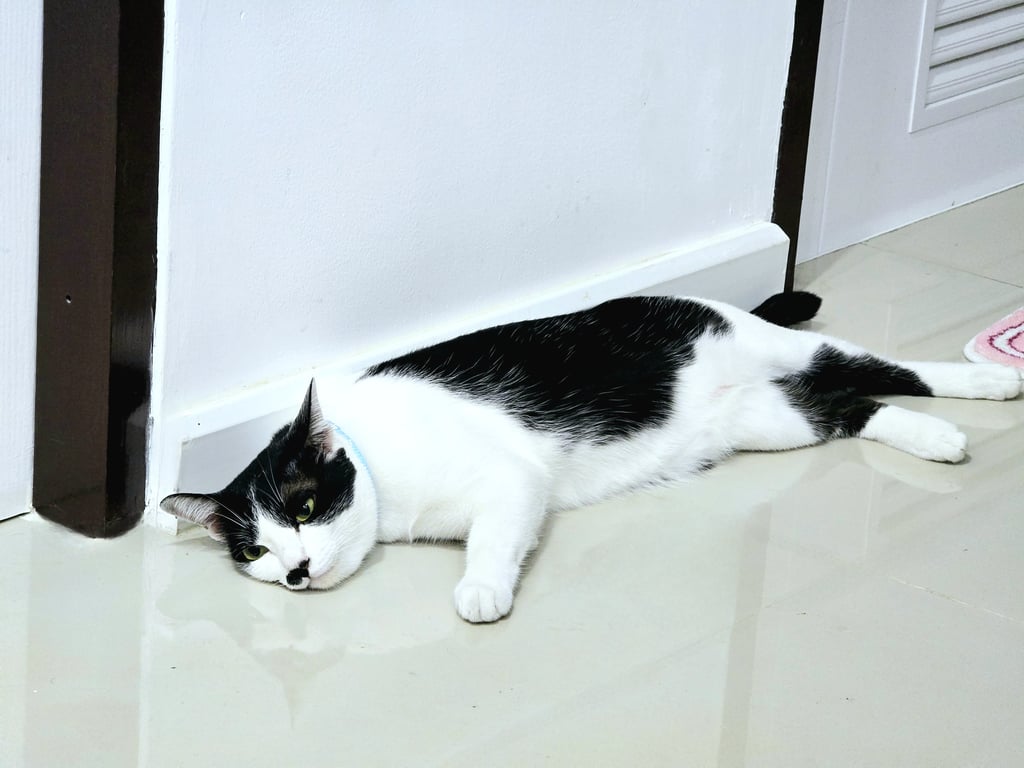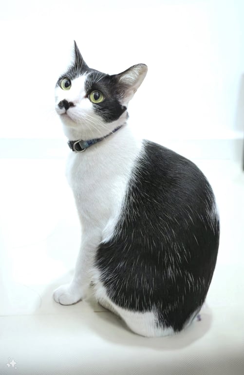 รอยตำหนิ: ขนดำใกล้จมูกเหมือนหนวดผู้ชาย ขนดำบริเวรหางตา ขนขาวเป็นเส้นยาวตามหลัง ขนดำบริเวณหน้าเหมือนใส่หน้ากาก ช่วงคอเป็นขนขาวขี้กลัว เสียงเบา สวมปลอกคอสีฟ้าลายไม่มีกระดิ่ง