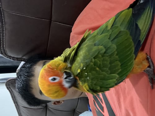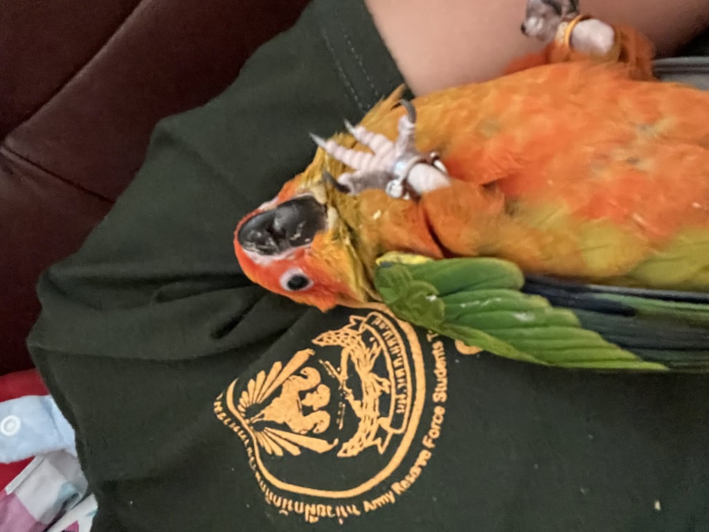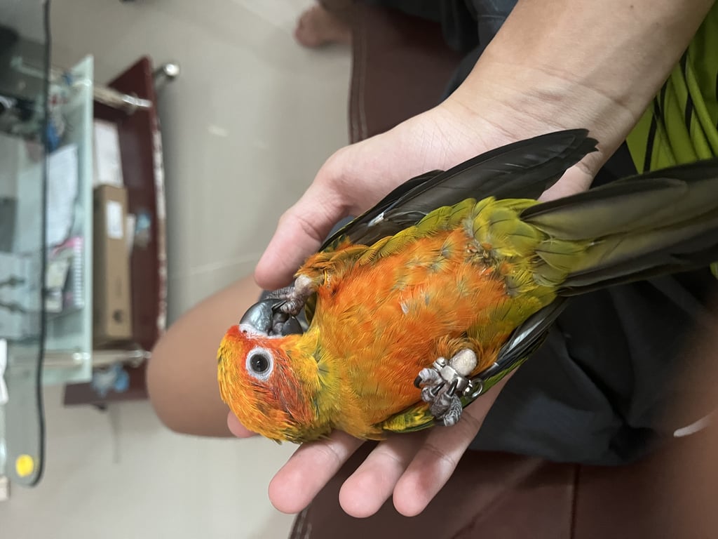 รอยตำหนิ: ตรงใต้ปากนก มีคาบอาหารลูกป้อนเปื้อนนิดหน่อย และใส่ห่วงขาสีทอง กับห่วงเปิดติดคน ขี้อ้อน อายุ3เดือน ใส่ห่วงขาสีทองสลักเบอร์ไว้ และใส่ห่วงเปิด ปีกสีเขียว ตัวสีเหลืองผสมส้มอ่อนๆ