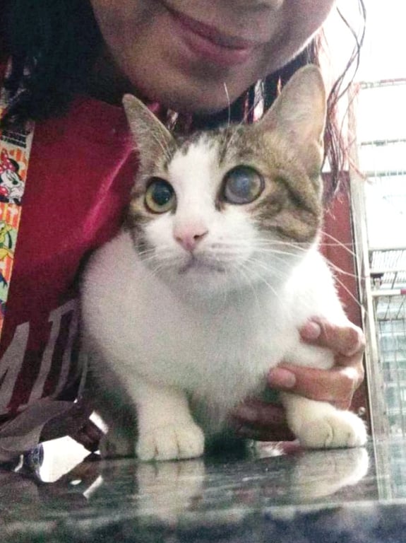 รอยตำหนิ: ตาซ้ายขุ่น ขาหน้ามีขนน้อยจากรอยโกนขนเพื่อให้น้ำเกลือ รูปร่างเล็กและผอมขี้ตกใจ ขี้กลัว ชอบกินไก่ มีโรคประจำตัวเป็นลูคีเมียต้องทานยาทุกวัน