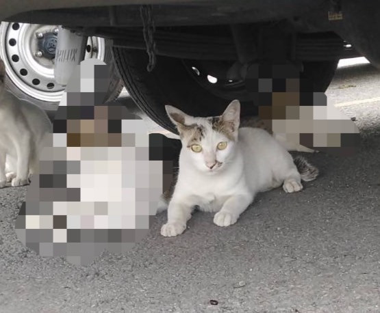 แต้มลายสลิดมุมปากซ้าย, โคนหูสองข้าง และหาง ลำตัวสีขาวล้วน ตาสีเหลือง