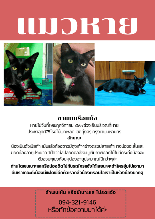 ตอน16:50น้องยังอยู่หน้าบ้านหลังจากไปอาบน้ำแล้วออกมาน้องก็ไม่อยู่แล้วตอนแรกคิดว่าน้องไปเดินเล่นตามปกติเดี๋ยวก็กลับมากินข้าวพอเช้าอีกวันน้องไม่กลับมาเลยรู้ว่าน้องหายได้ทำการตะโกนเรียกและเขย่าอาหารเรียกถามคนแถวบ้านก็ไม่มีใครเจอน้องเลยคาดว่าโดนอุ้มไปน้องมีถุงเท้าเต็ม2เท้าหลัง2เท้าหน้าปลายเท้าจะสีขาวนะคะ