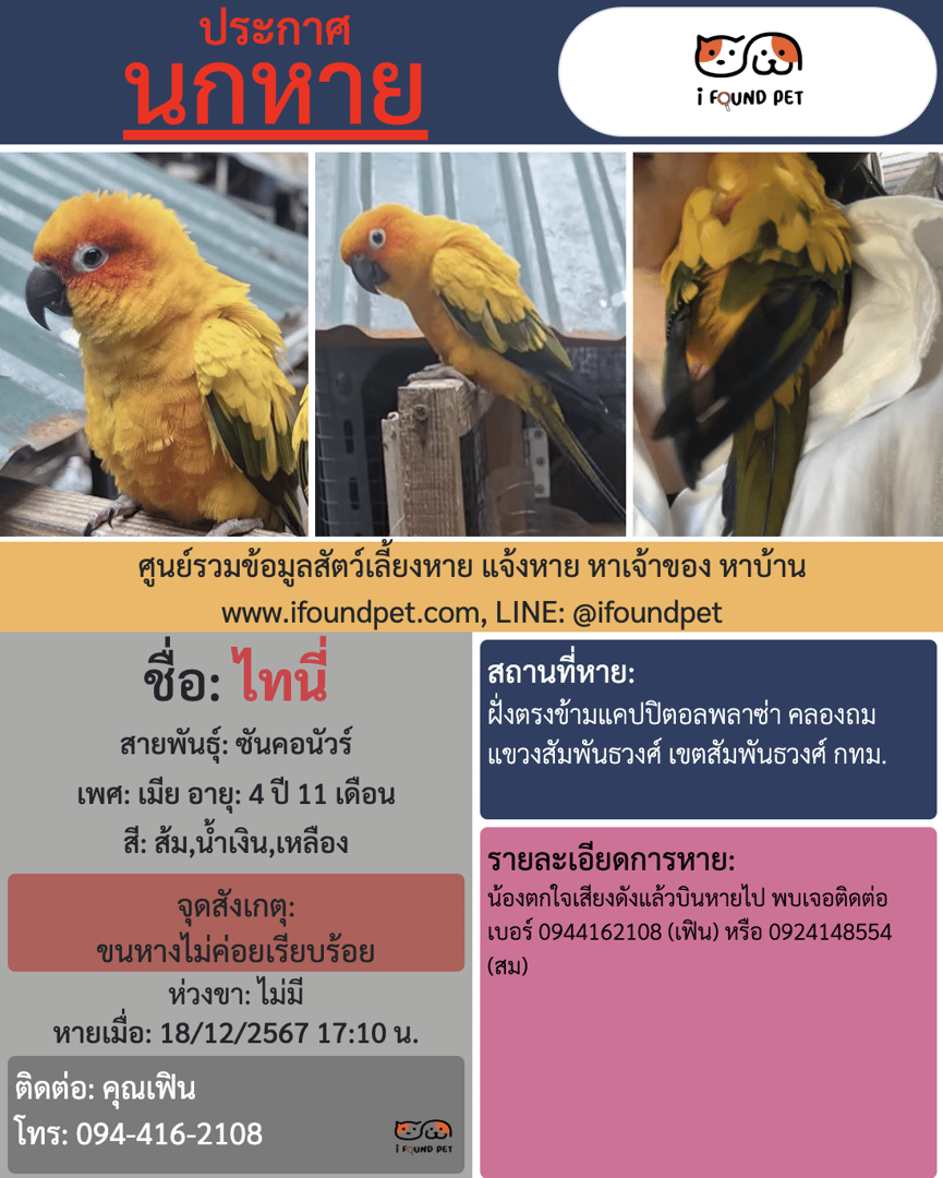 น้องตกใจเสียงดังแล้วบินหายไป พบเจอติดต่อเบอร์ 0944162108 (เฟิน) หรือ 0924148554 (สม)