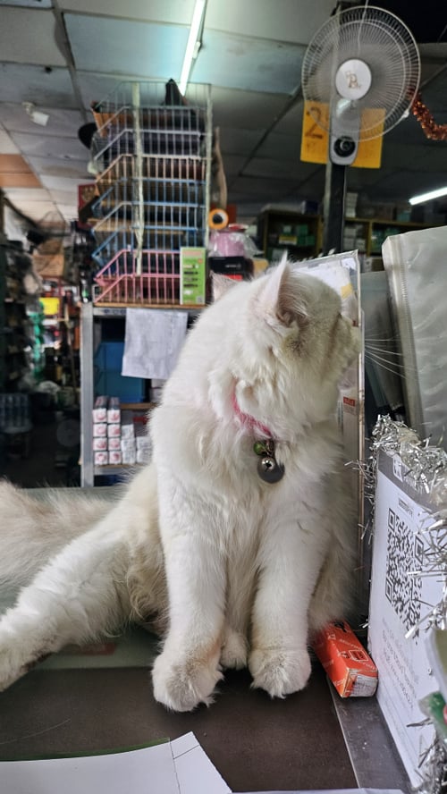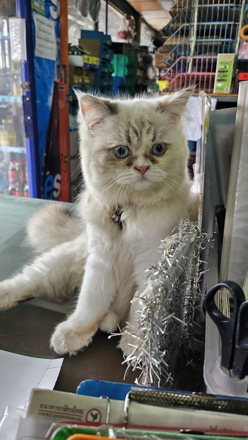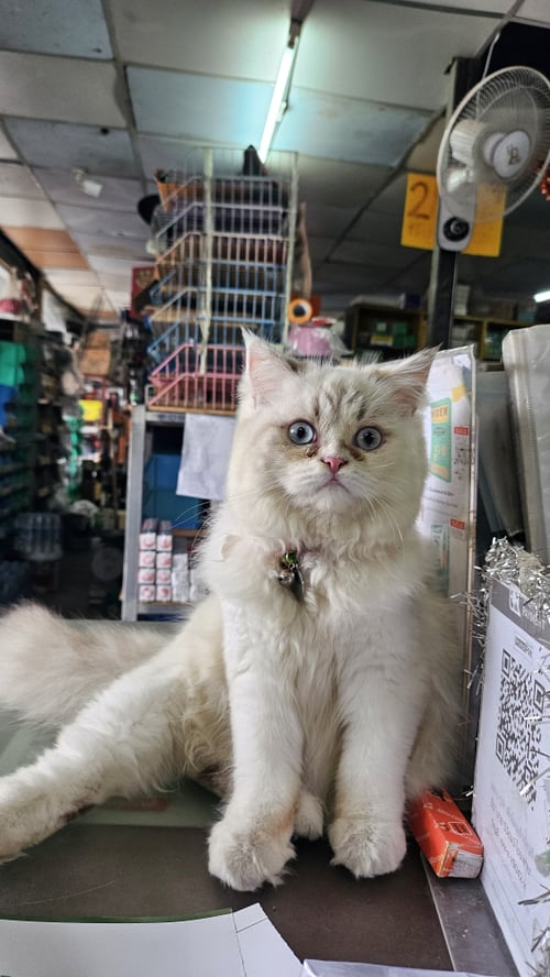 น้ำหนัก3กก.ค่ะ สีขาว ที่หัวกับหางจะมีสีน้ำตาลผสม มีปลอกคอกับป้ายชื่อเบอร์โทรเจ้าของ