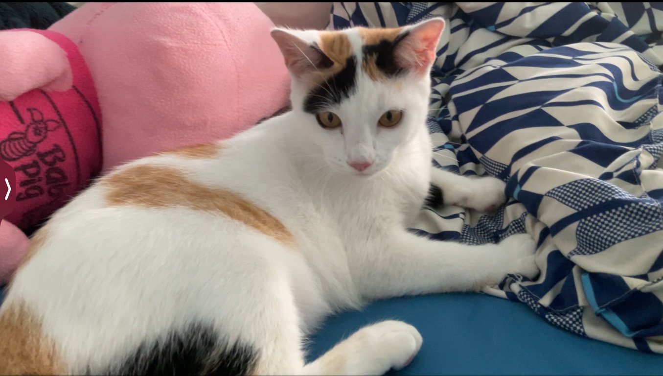 | ลักษณะเด่น | จมูกสีชมพู มีสีขาวเยอะสุด รองลงมาเป็นสีส้ม และสีดำแซมประปราย ตรงหางเป็นลายส้มดำทั้งหมด ไม่มีแซมสีขาว |