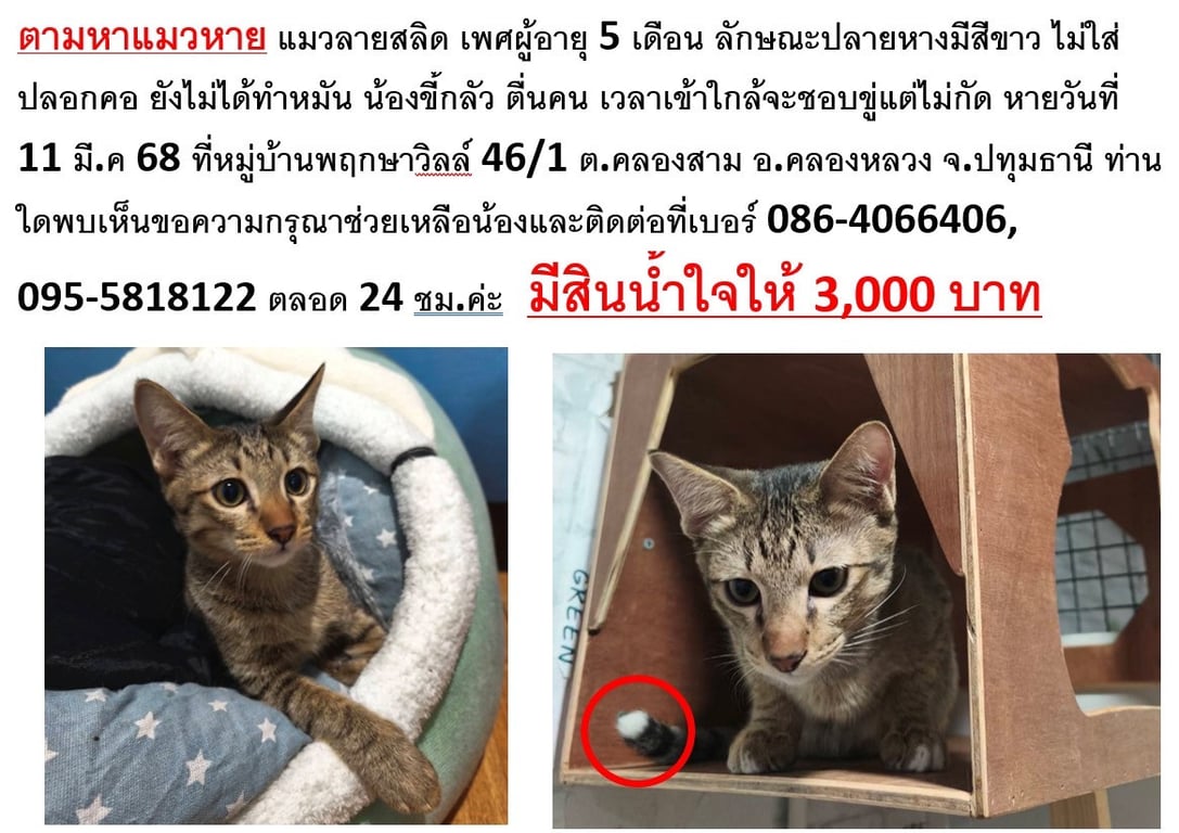 ลายสลิด อายุราว 5 เดือน ปลายหางเป็นสีขาว น้องขี้กลัวคน ขู่แต่ไม่กัด
