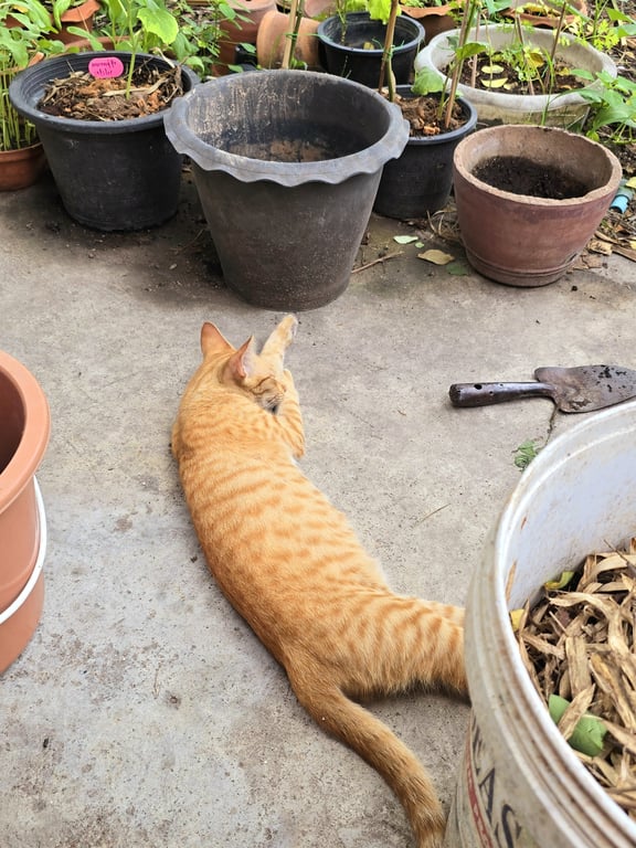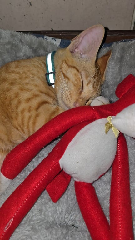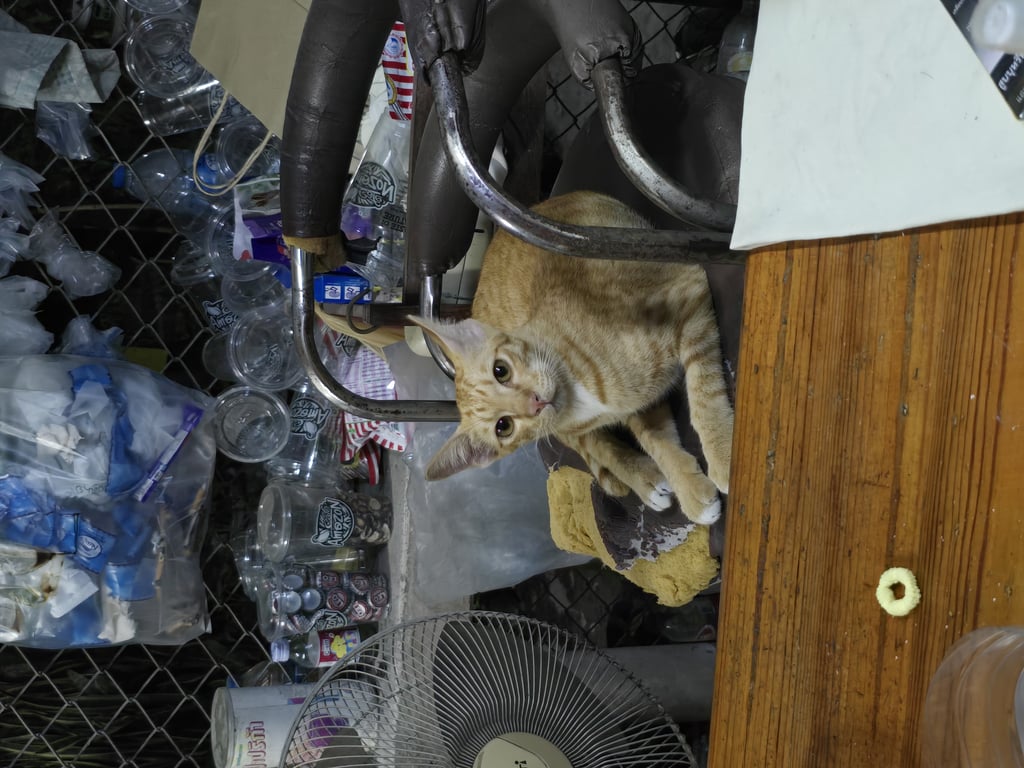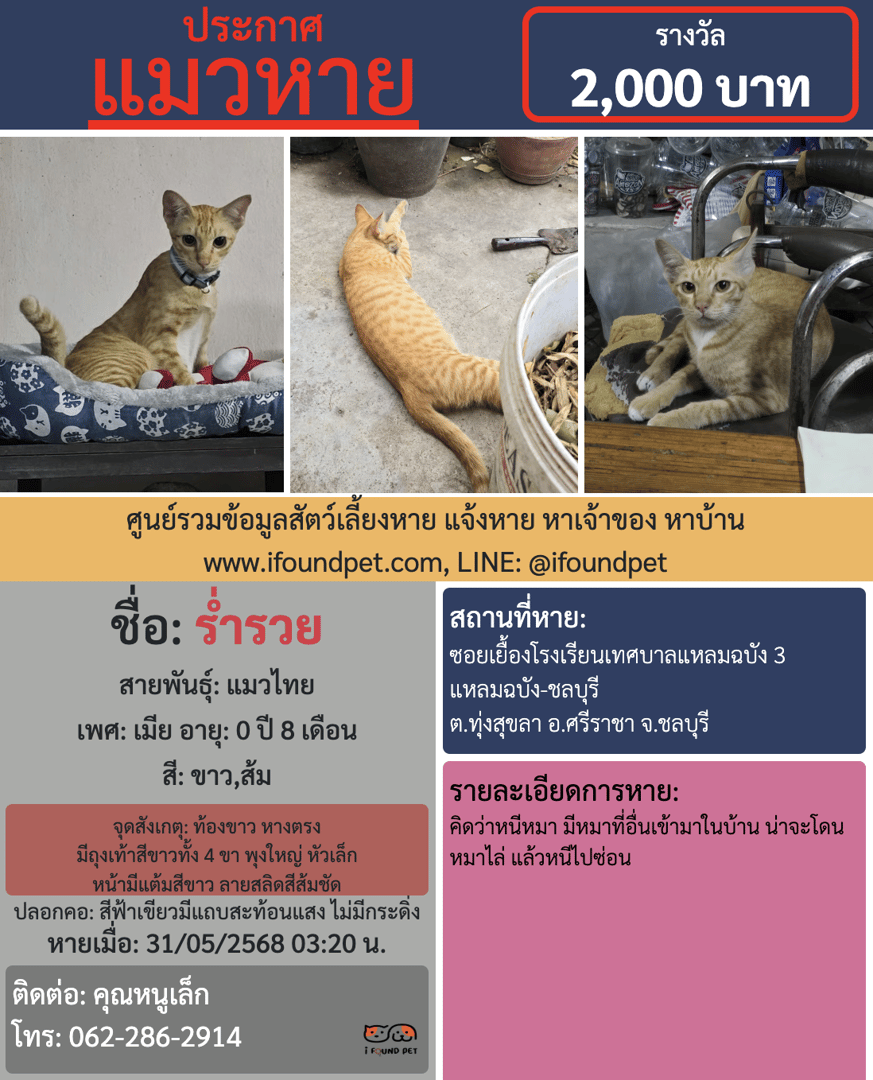 ท้องขาว หางตรง มีถุงเท้าสีขาวทั้ง 4 ขา พุงใหญ่ หัวเล็ก หน้ามีแต้มสีขาว ลายสลิดสีส้มชัด ค่อนข้าวกลัวคน ขู่เก่ง เสียงห้าวๆ เหมือนตัวผู้ ใส่ปลอกคอสีฟ้าเขียวมีแถบสะท้อนแสง