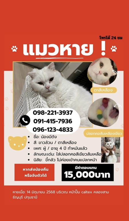 น้องแมวติดรถลูกบ้านในหมู่บ้านไป แล้วกระโดดลงจากใต้ท้องรถ หน้าปั๊มคาลเท็กซ์คลองสาม ยังไม่มีเบาะแสเพิ่มเติม ใครพบเห็นหรือนำไปเลี้ยงกรุณานำมาคืนเจ้าของด้วยค่ะ น้องยังมีพี่น้องแมวที่รออยู่ที่บ้าน😭😢