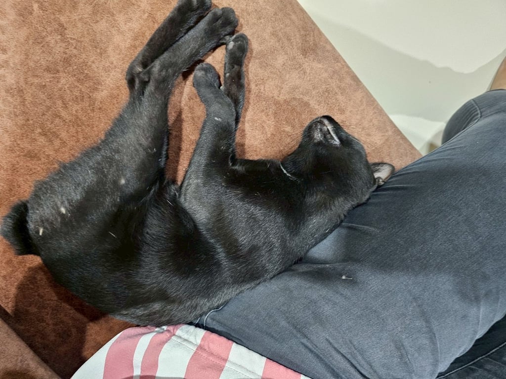 หางกุดเป็นพู่คล้ายกระต่าย ขาหลังมีรอยแผลหลายรอย สวมปลอกคอพื้นดำ ลายอุ้งเท้าแมวสีม่วงสลับเหลือง