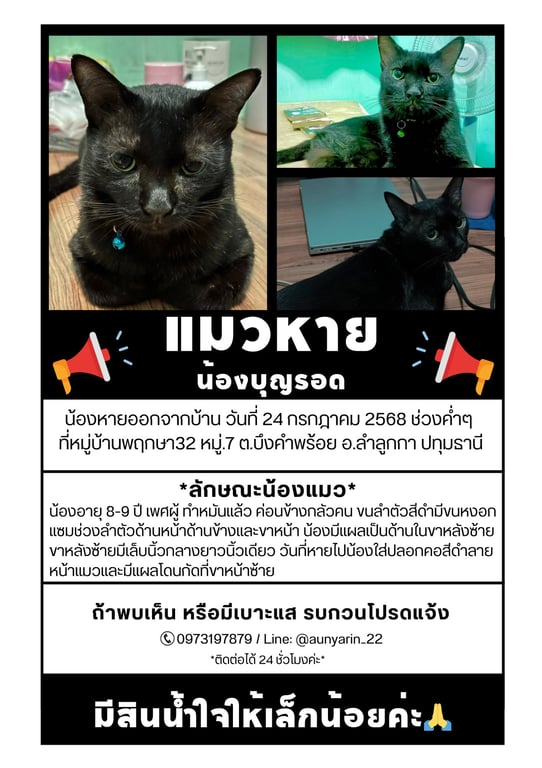 วันที่หายไปน้องออกไปนอนเล่นแถวคอมแอร์บ้านข้างๆปกติ วันนั้นฝนตกหนักก่อนฝนตก ออกไปเรียกน้องแล้วน้องไม่ออกมาและฝนตกแรงขึ้นจึงเข้าบ้านพอฝนซาออกมาเรียกใหม่น้องก็ยังไม่ออกมาจนเช้า แต่เพื่อนบ้านระแวกบ้านจากที่สอบถามช่วงวันที่24-25 กรกฎาคม 68 เพื่อนบ้านยังมีบางท่านพบเห็นน้องอยู่ค่ะ