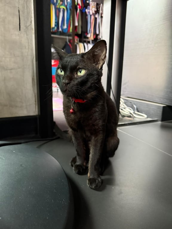 ฟันข้างขวาหัก ตาเขียวเหลือง หัวนมขาว หางยาว ดำล้วน ขี้อายกลัวคน ไม่กัด ดิ้นหนีบ่อย