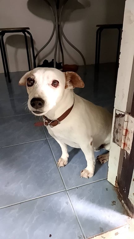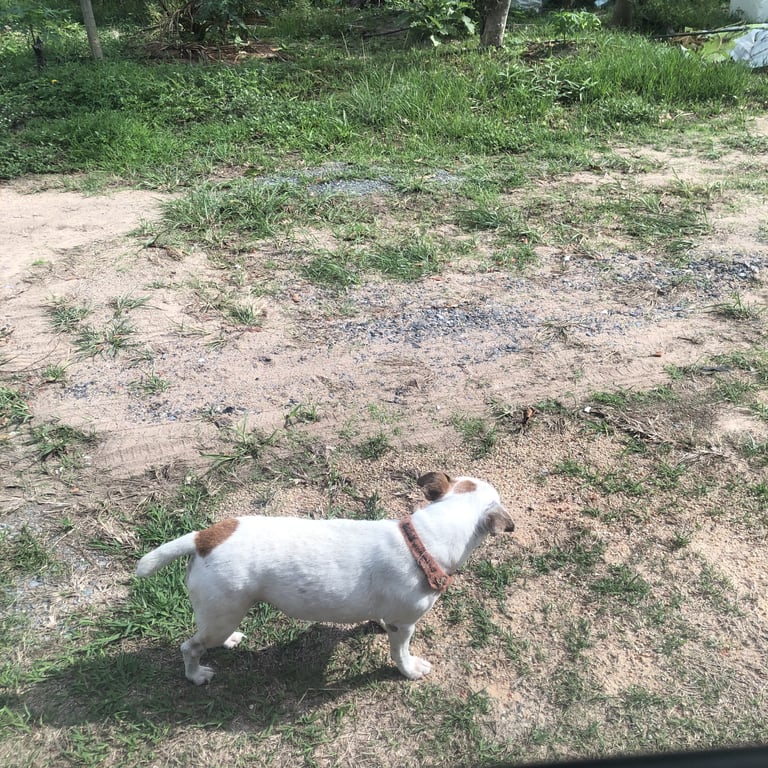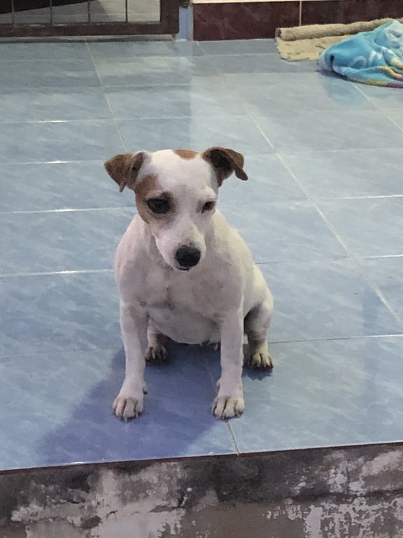 ตัวสีขาว ลายจุดสีน้ำตาล หูสีน้ำตาล มีจุดวงกลมสีน้ำตาลบริเวณเกือบถึงหาง หมาพันธุ์เล็ก อายุเยอะแล้วค่ะ