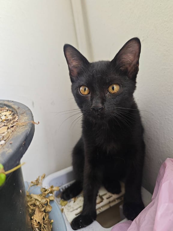 ตาสีเหลืองทอง ขนหางฟู ดำทั้งตัว มีหนวดสีขาว1เส้น