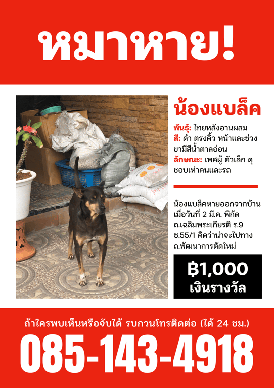 น้องแบล็คน่าจะติดสัด น้องเคยหายออกจากบ้านไปทางถ.พัฒนาการตัดใหม่อยู่หนึ่งครั้ง ซึ่งคุณลุงพบเห็นว่าอยู่กับแก๊งหมาจรที่นั่น แต่ไม่กี่วันก็กลับบ้านมา แต่ครั้งนี้ไม่มีใครพบเห็นเลยค่ะ