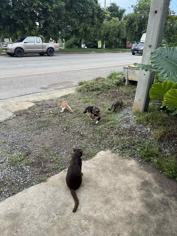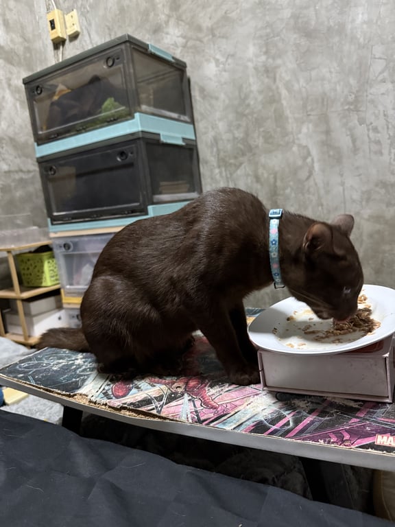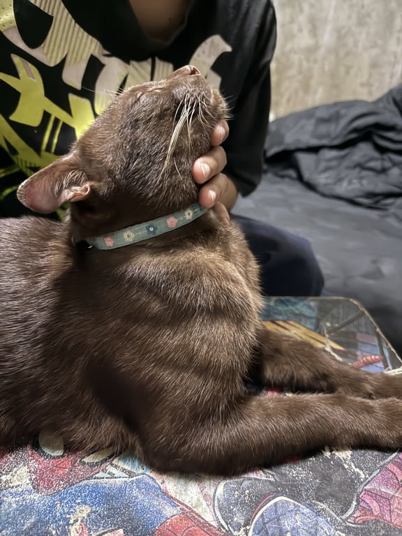 น้องเป็นแมวเพศผู้ สีน้ำตาลเข้มช็อกโกแลต ขนสั้น คิ้วบาง ใส่ปลอกคอสีน้ำเงินลายตาราง ไม่มีกระดิ่ง ให้อุ้มได้ไม่ดุ แต่ไม่ชอบให้จับท้องกับจับมือและเท้า