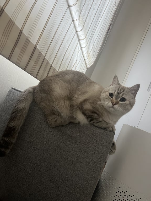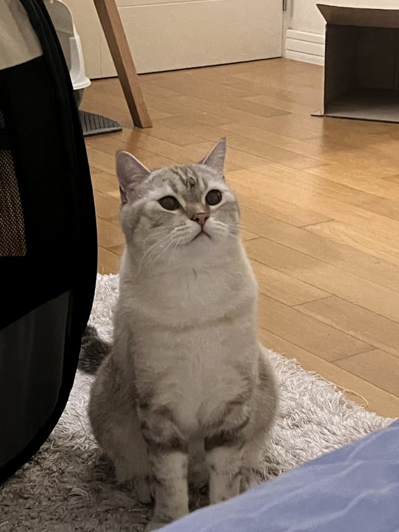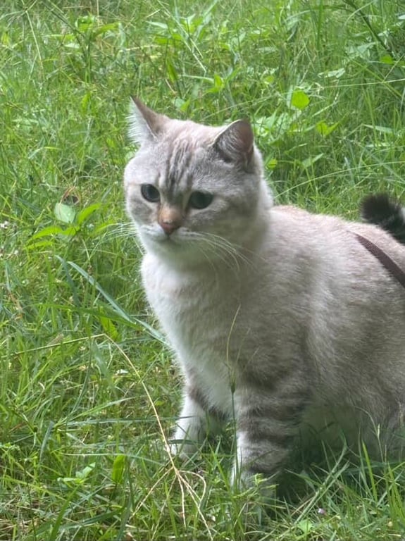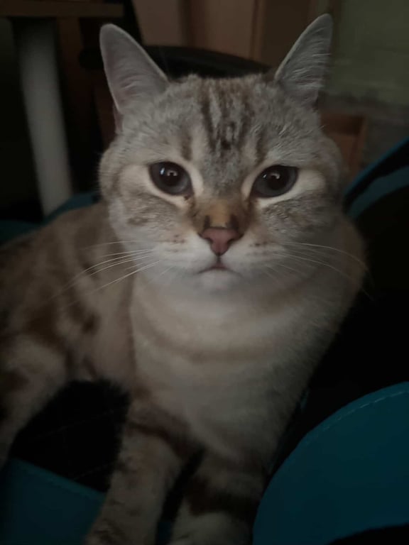สีเทาขาว ลายสลิดนิดหน่อย พุงย้อย หนัก 5 โล เวลาจมูกเปียกจะเป็นรอยที่จมูก