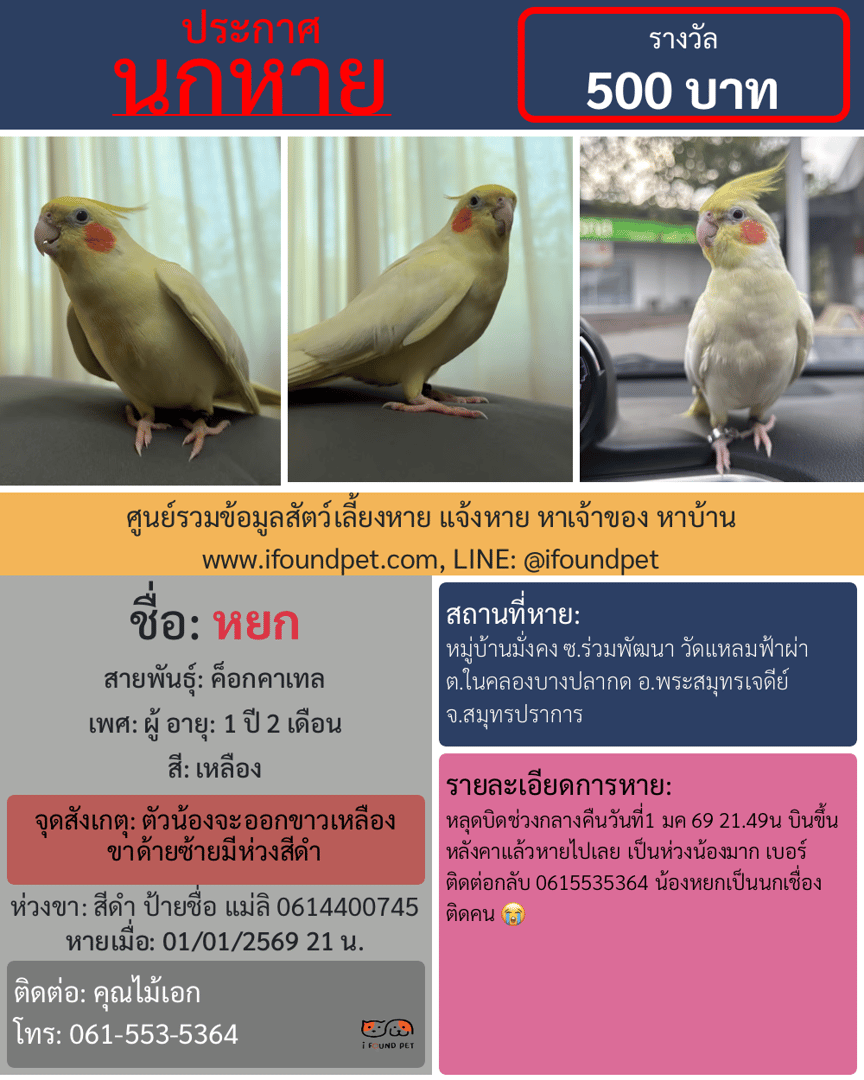 หลุดบิดช่วงกลางคืนวันที่1 มค 69 21.49น บินขึ้นหลังคาแล้วหายไปเลย เป็นห่วงน้องมาก เบอร์ติดต่อกลับ 0615535364 น้องหยกเป็นนกเชื่อง ติดคน 😭