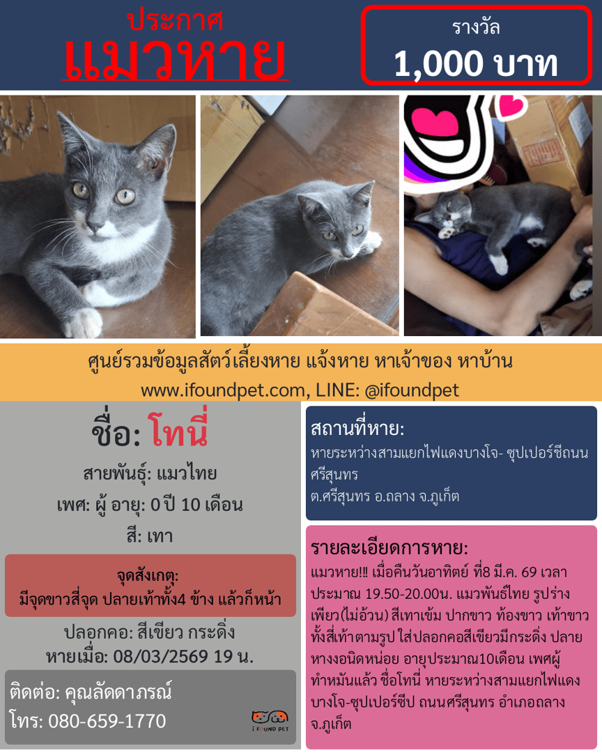 แมวหาย!!! เมื่อคืนวันอาทิตย์ ที่8 มี.ค. 69 เวลาประมาณ 19.50-20.00น. แมวพันธ์ไทย รูปร่างเพียว(ไม่อ้วน) สีเทาเข้ม ปากขาว ท้องขาว เท้าขาวทั้งสี่เท้าตามรูป ใส่ปลอกคอสีเขียวมีกระดิ่ง ปลายหางงอนิดหน่อย อายุประมาณ10เดือน เพศผู้ ทำหมันแล้ว ชื่อโทนี่ หายระหว่างสามแยกไฟแดงบางโจ-ซุปเปอร์ซีป ถนนศรีสุนทร อำเภอถลาง จ.ภูเก็ต