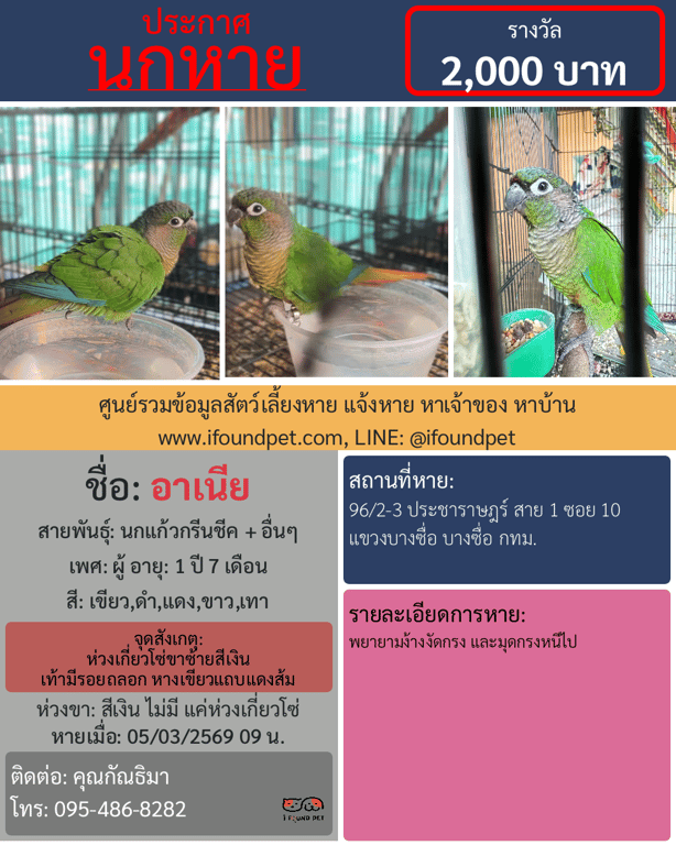 ห่วงเกี่ยวโซ่ขาซ้ายสีเงิน ไม่มีชื่อหรือเบอร์โทร เท้ามีรอยถลอก หางเขียวแถบแดงส้ม