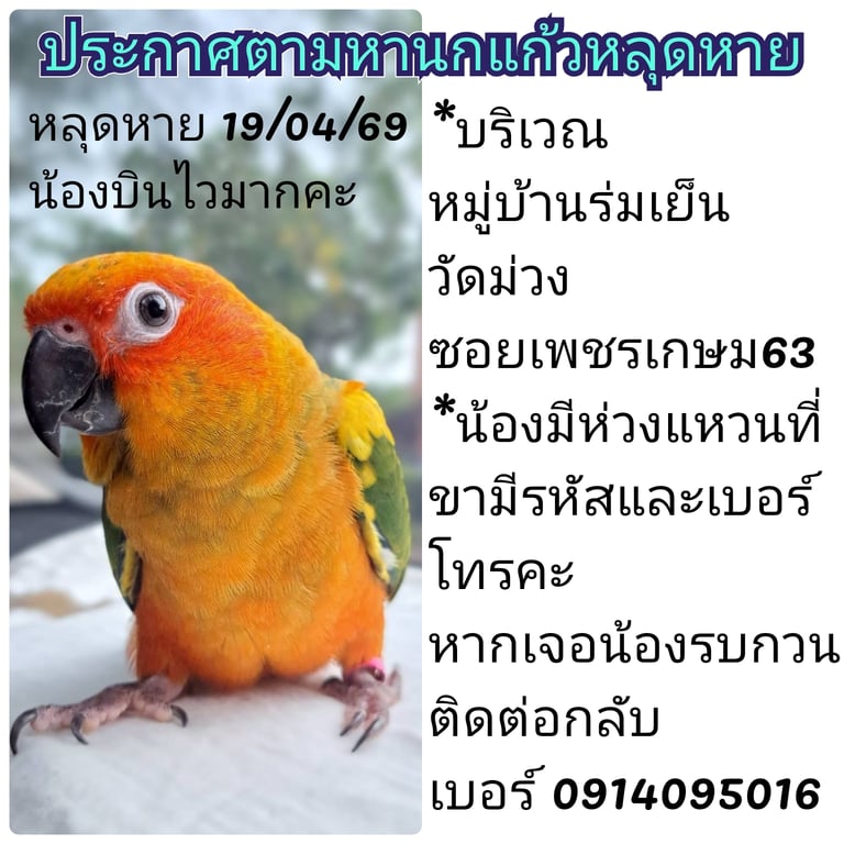 มีแหวนสีขมพูที่ขา มีรหัสและเบอร์ติดต่อ นิสัยติดเจ้าของ ชอบโยกหัว