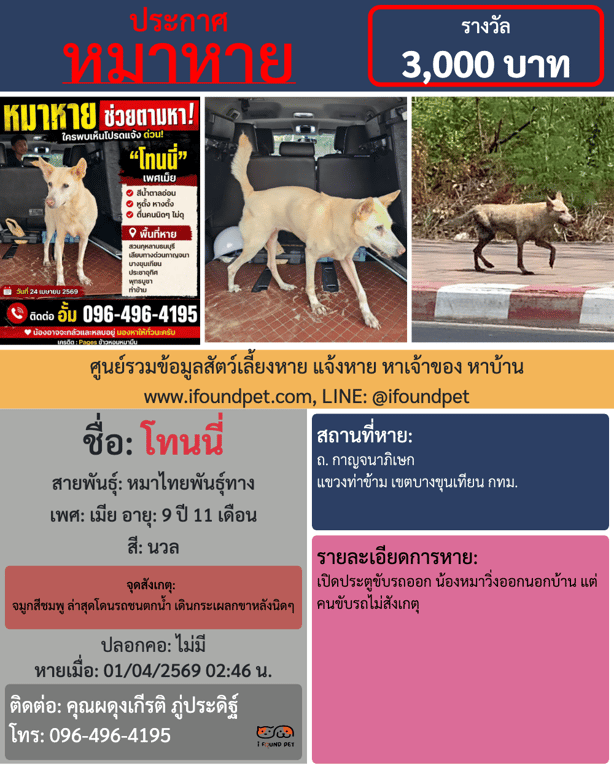 | ลักษณะเด่น | จมูกสีชมพู ล่าสุดโดนรถชนตกน้ำ เดินกระเผลกขาหลังนิดๆ |