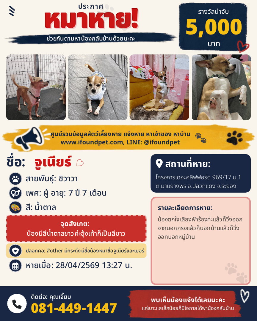 | ปลอกคอ | มีกระดิ่งมีชื่อน้องหมาชื่อจูเนียร์และเบอร์โทร 081-449-1447 |
