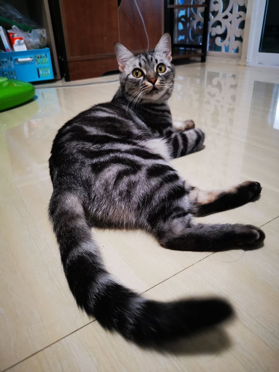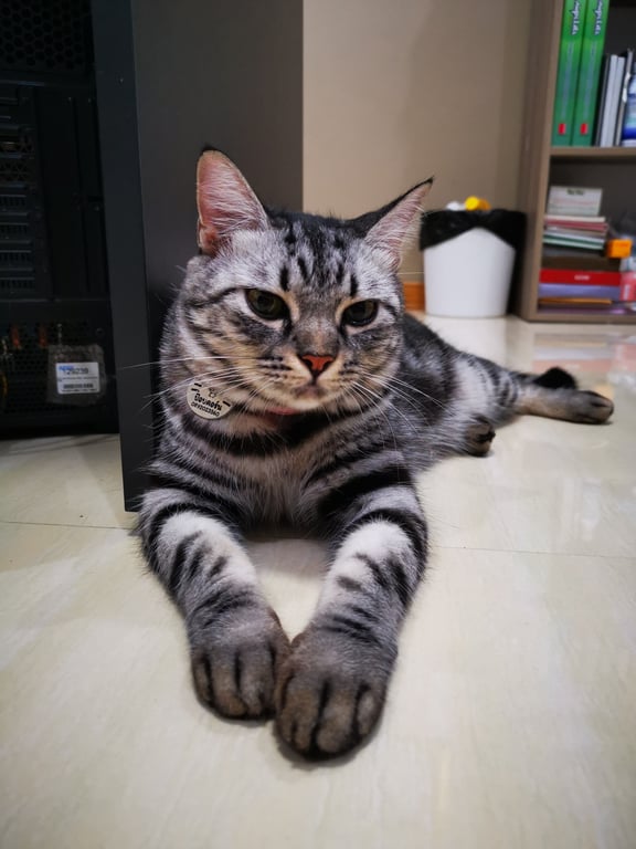 ลายชัด หางยาว จมูกชมพู มีปลอกคอสีชมพู ติดป้ายชื่อและแอร์แทค (ไม่แน่ใจว่าหลุดหายไปหรือยัง)
