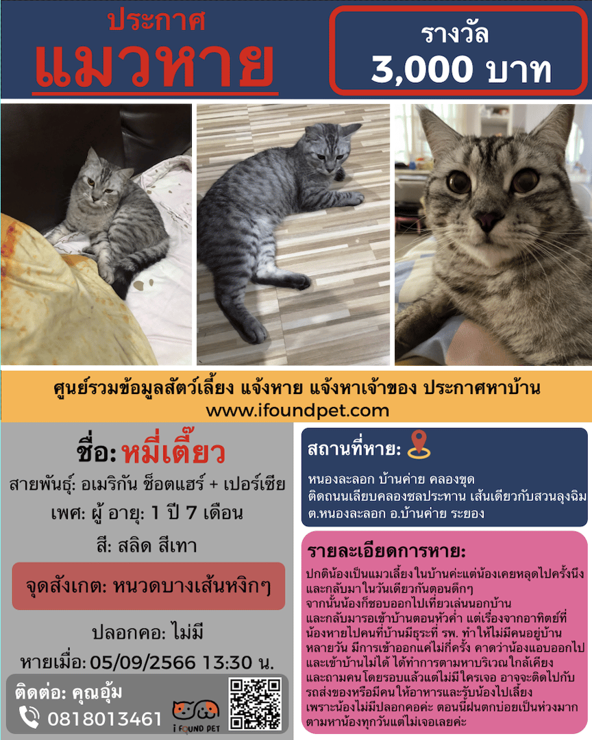 ปกติน้องเป็นแมวเลี้ยงในบ้านค่ะแต่น้องเคยหลุดไปครั้งนึงและกลับมาในวันเดียวกันตอนดึกๆ จากนั้นน้องก็ชอบออกไปเที่ยวเล่นนอกบ้านและกลับมารอเข้าบ้านตอนหัวค่ำ แต่เรื่องจากอาทิตย์ที่น้องหายไปคนที่บ้านมีธุระที่โรงพยาบาลทำให้ไม่มีคนอยู่บ้านหลายวัน มีการเข้าออกแค่ไม่กี่ครั้ง คาดว่าน้องแอบออกไปและเข้าบ้านไม่ได้ ได้ทำการตามหาบริเวณใกล้เคียงและถามคนโดยรอบแล้วแต่ไม่มีใครเจอ อาจจะติดไปกับรถส่งของหรือมีคนให้อาหารและรับน้องไปเลี้ยงเพราะน้องไม่มีปลอกคอค่ะ ตอนนี้ฝนตกบ่อยเป็นห่วงมาก ตามหาน้องทุกวันแต่ไม่เจอเลยค่ะ