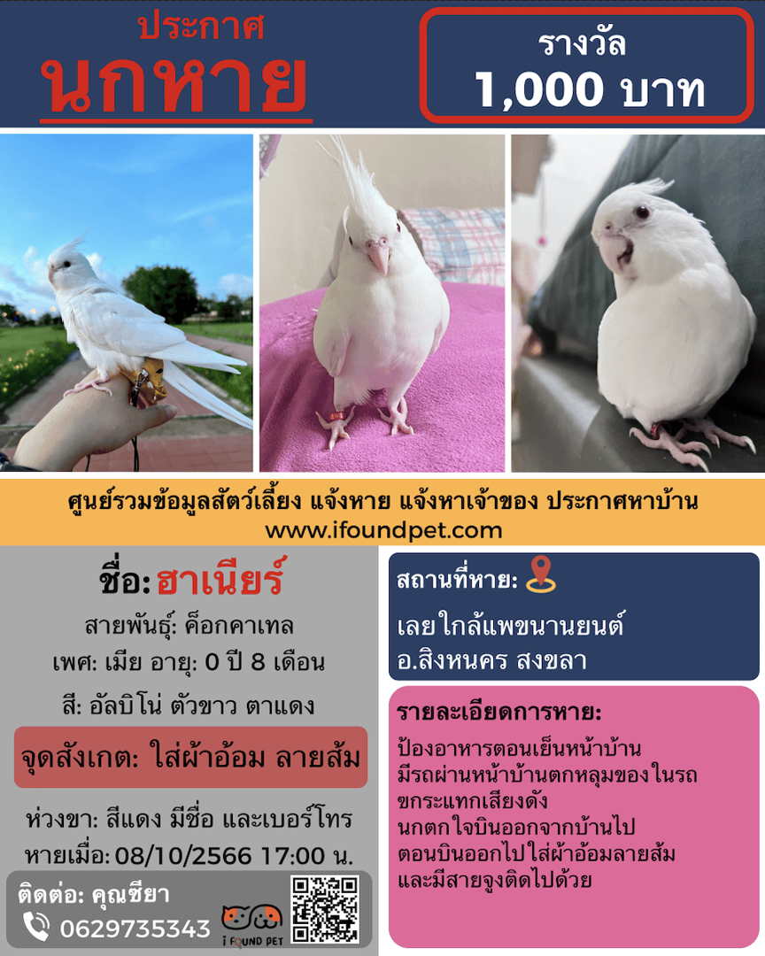 ตัวสีขาว ตาสีแดง ใส่ห่วงขาขวาสีแดง มีชื่อและเบอร์โทร ใส่ผ้าอ้อม ลายส้ม