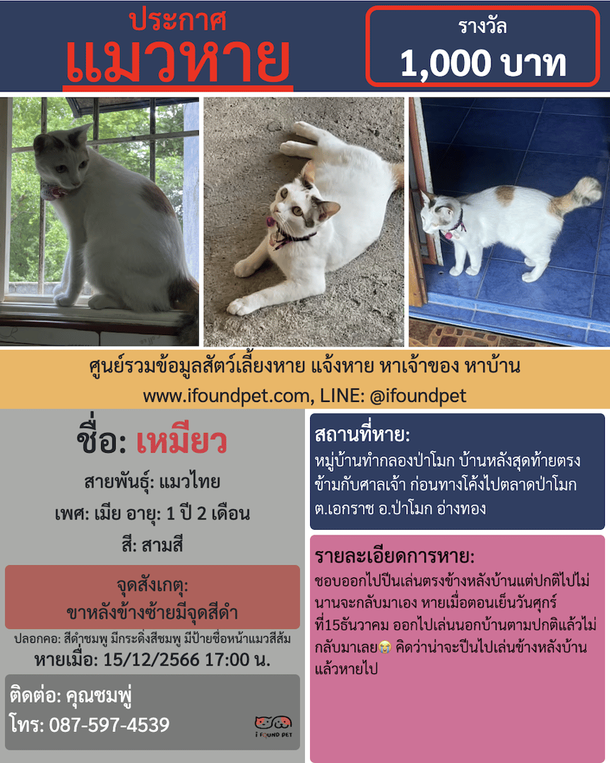 ขาหลังข้างซ้ายมีจุดสีดำ ใส่ปลอกคอสีดำชมพูมีป้ายชื่อหน้าแมวสีส้มมีเบอร์โทรศัพท์