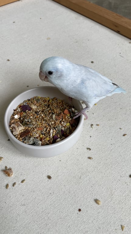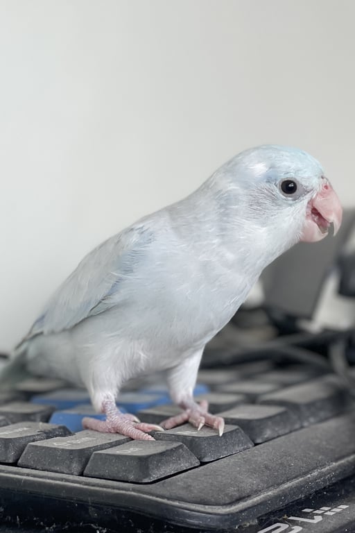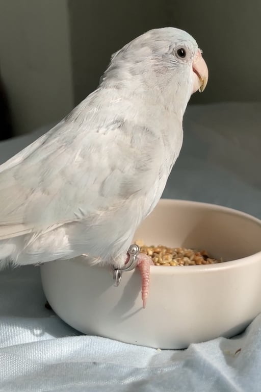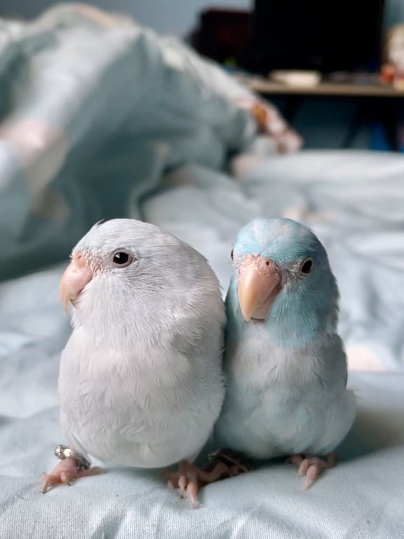 ลักษณะ 🪽 🤍มูมู่ : มีห่วงขาที่ข้อเท้าข้างขวา เพศเมีย 🩵บลูบรูซ : ไม่มีห่วงขา ตรงหางตามีขนสีฟ้าอ่อนๆ บนหัวมีพายสีขาว เพศชาย 🤍น้องเป็นสีอเมริกันไวท์ทั้งคู่ค่ะ🩵