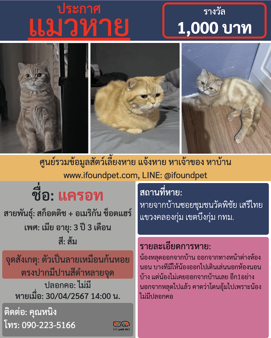 น้องหลุดออกจากบ้าน ออกจากทางหน้าต่างห้องนอน บางทีมีให้น้องออกไปเดินเล่นนอกห้องนอนบ้าง แต่น้องไม่เคยออกจากบ้านเลย อีก1อย่างนอกจากหลุดไปแล้ว คาดว่าโดนอุ้มไปเพราะน้องไม่มีปลอกคอ