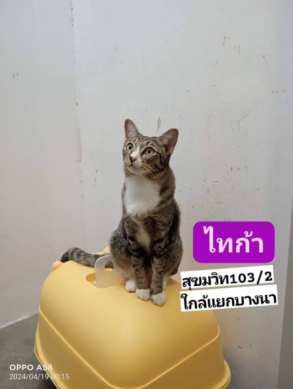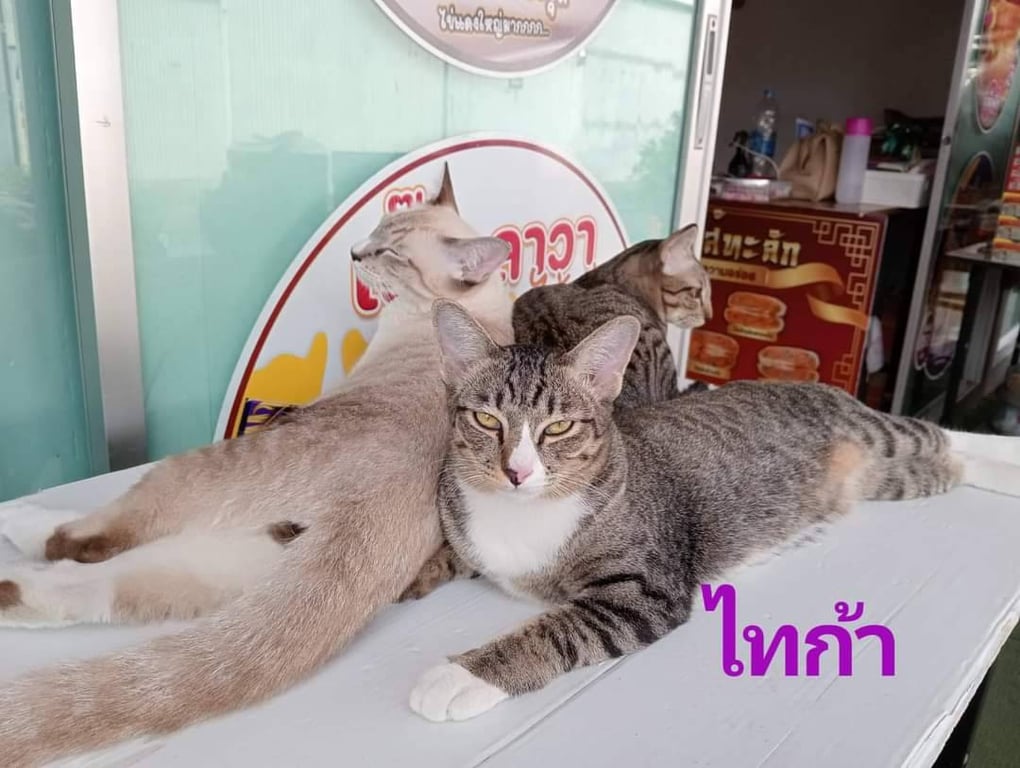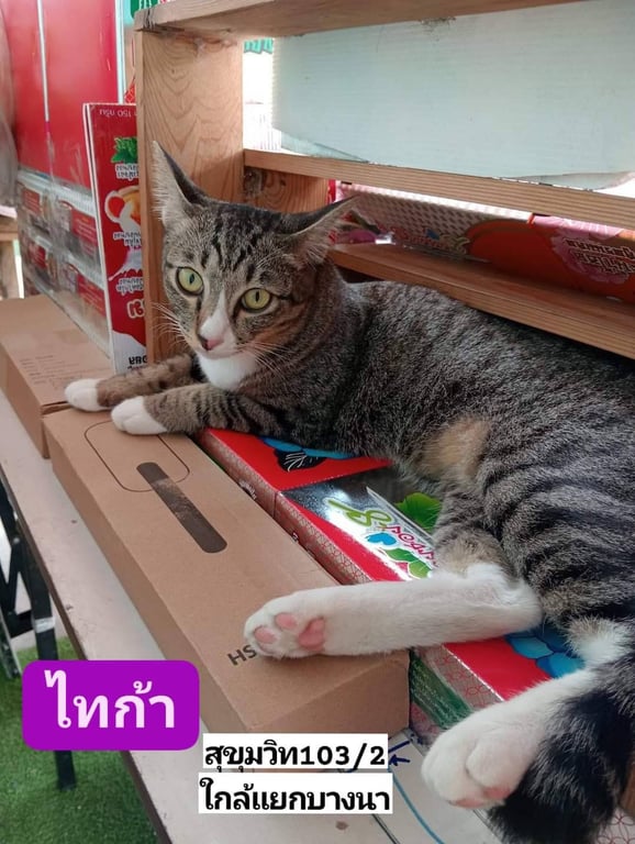 ไทก้า ผู้หญิง อายุ1ปี ทำหมันแล้ว แมวไทยลายสลิด ตาโต มีถุงเท้าทั้ง4 ด้านหน้าถุงเท้าก้านหน้าสั้น ถุงเท้าด้านหลังยาว ที่หน้าอกจะขาวเหมือนผ้าเอี๊ยม จมูกดำขาว(ดำ=ด้านขวา,ขาว=ด้านซ้าย) ช่วงปลายหางคดนิดหนึ่ง ไม่ชอบให้อุ้ม น้องขนนิ่ม ตัวเล็ก น้ำหนัก~3กิโล ชอบทำเสียงขู่ หากเราแหย่หรือจะตี