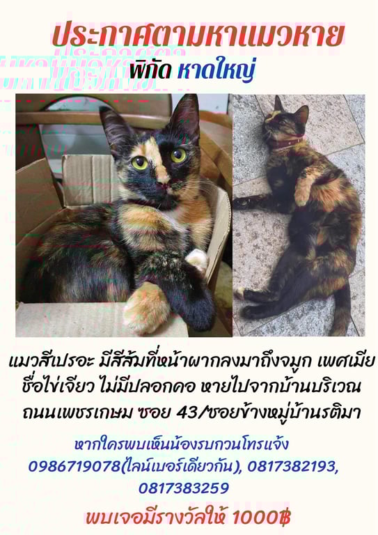 ปกติเลี้ยงแบบเปิดให้ออกมาเล่นบริเวณหน้าบ้านซึ่งน้องจะกลับบ้านถูกเสมอแต่ครั้งนี้น้องหายไปไม่กลับบ้านมาหลายวันจึงคาดว่าน้องจะหลงไปทางอื่นแล้วกลับบ้านไม่ได้ค่ะ