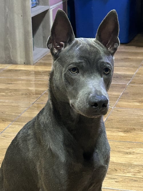 ไม่ดุ ขี้กลัว ขนสั้นสีเทาเข้ม หูตั้ง หางม้วน ใส่ปลอกคอสีแดง