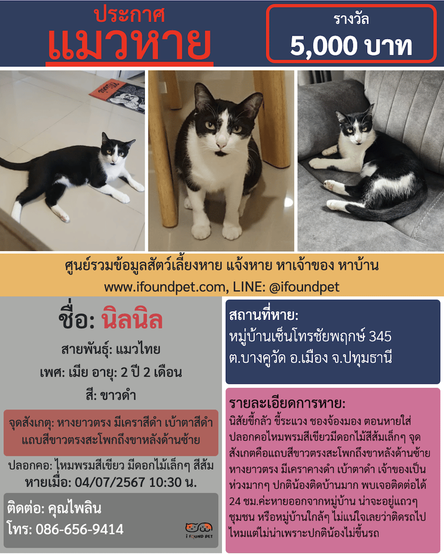 นิสัยขี้กลัว ขี้ระแวง ชองจ้องมอง ตอนหายใส่ปลอกคอไหมพรมสีเขียวมีดอกไม้สีส้มเล็กๆ จุดสังเกตคือแถบสีขาวตรงสะโพกถึงขาหลังด้านซ้าย หางยาวตรง มีเคราคางดำ เบ้าตาดำ เจ้าของเป็นห่วงมากๆ ปกติน้องติดบ้านมาก พบเจอติดต่อได้ 24 ชม.ค่ะหายออกจากหมู่บ้าน น่าจะอยู่แถวๆชุมชน หรือหมู่บ้านใกล้ๆ ไม่แน่ใจเลยว่าติดรถไปไหมแต่ไม่น่าเพราะปกติน้องไม่ขึ้นรถ