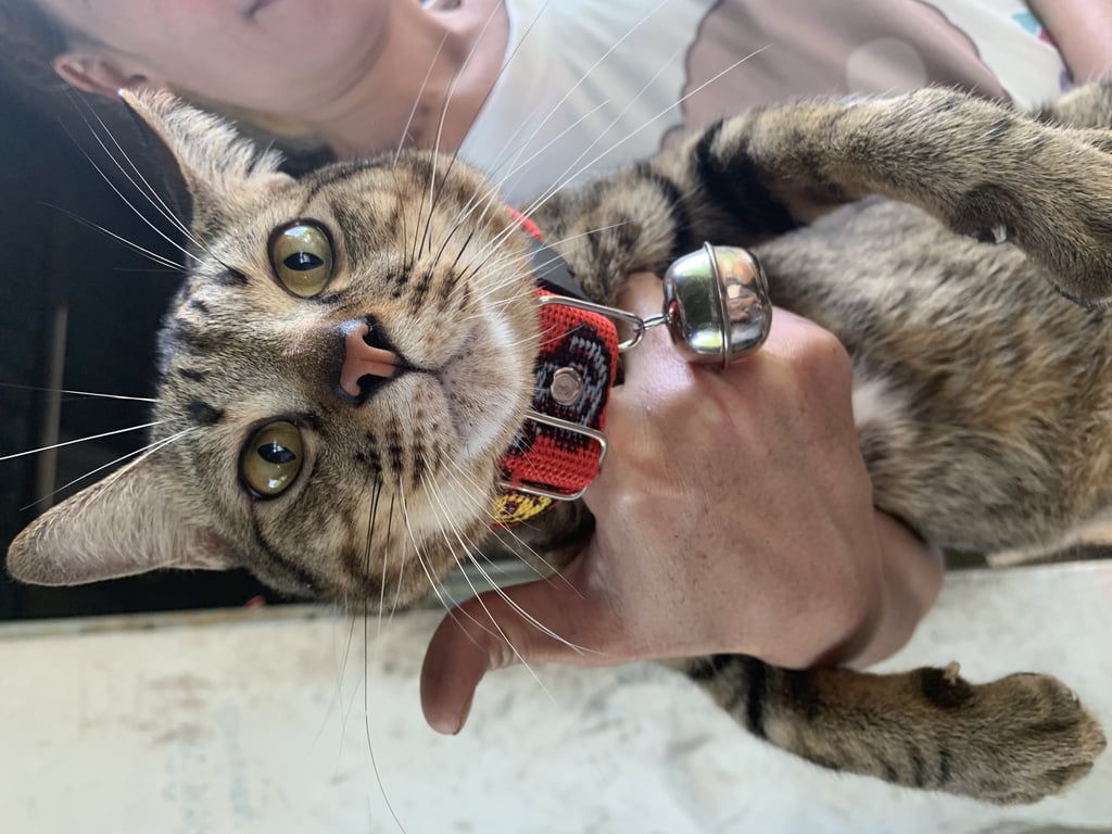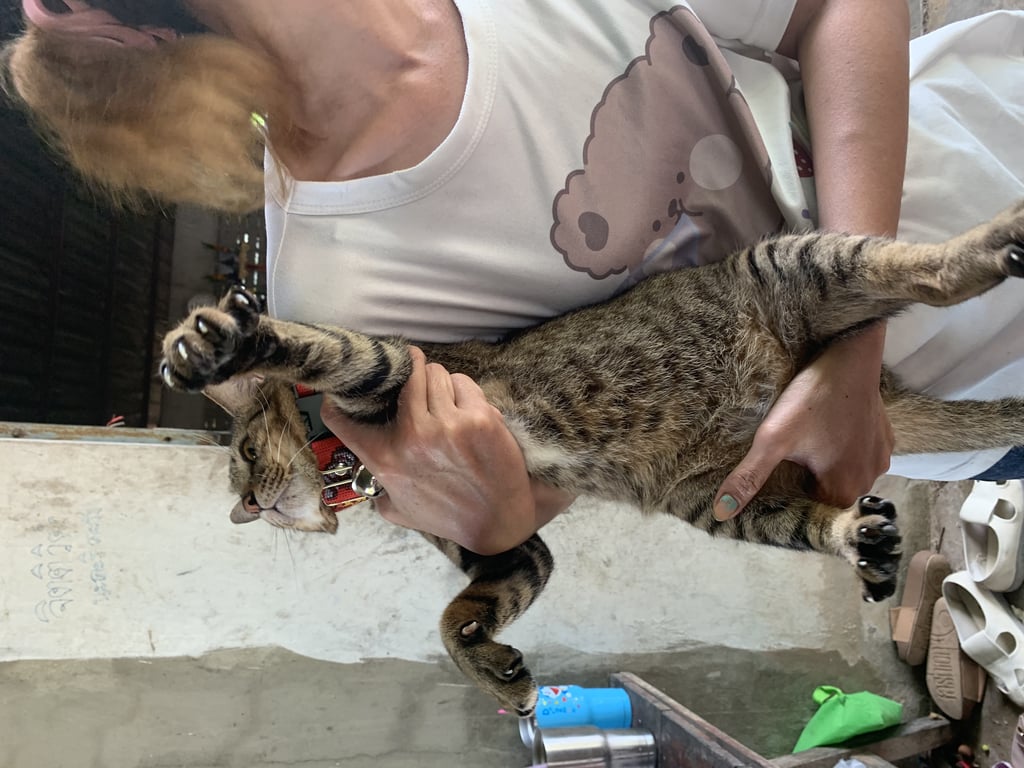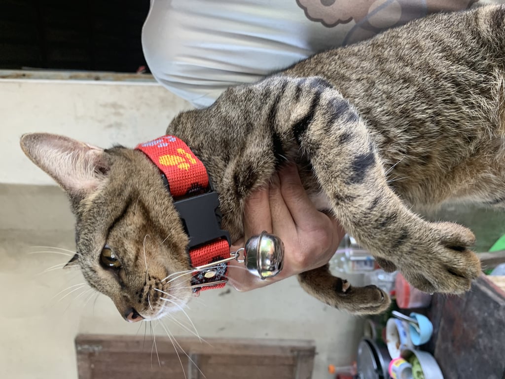 แมวตัวค่อนข้างใหญ่ลายสลิดช่วงอกสีขาว คางสีขาว