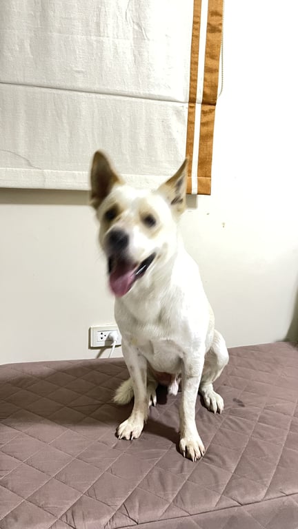 หนักประมาณ 10 กก กินอาหารเม็ดแล้วจะอ้วก กินเยอะ ติดคน ไม่เห่าเสียงดัง