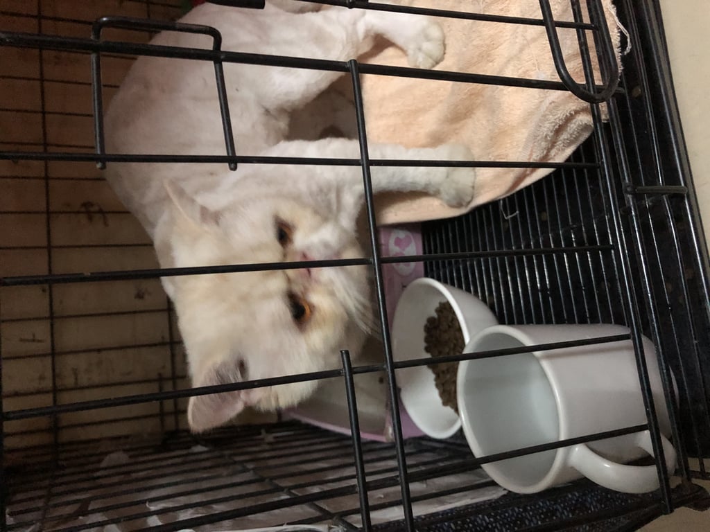 น้องเป็นแมวหน้ายู่ น่าจะพันธุ์เอ็กโซติก ชอร์ตแฮร์ วันแรกที่เจอน้องตัวมอมแมม ขนสีขาวๆเทาๆ ขนสั้น หางเหมือนถูกตัดขนรักษา มีแผลตามตัวเล็กน้อย ดูหิวและผอม แต่ขี้อ้อนและไม่กลัวคนเลย