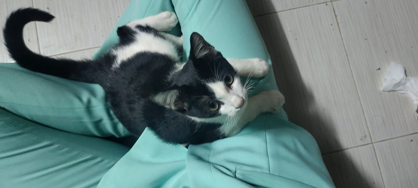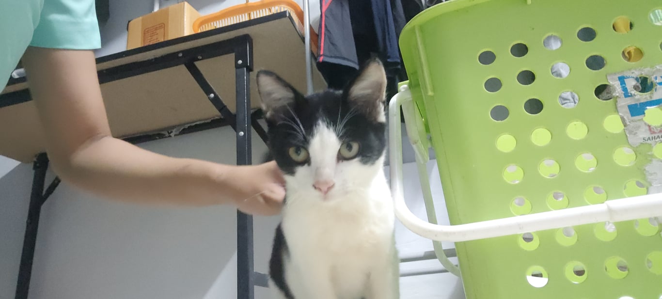 อายุประมาณ 4 เดือน เพศผู้ สีขาวดำ คุ้นคนขี้อ้อน หนวดเหมือนถูกตัด