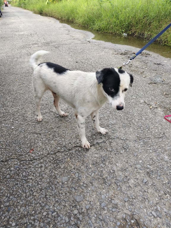 เป็นน้องหมาสีขาวลายดำ ที่หน้าเป็นสีดำครึ่งหน้าน้องยังเป็นหมาเด็ก