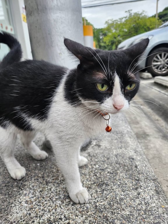 ปลอกคอสะท้อนแสง มีกระดิ่งสีส้ม น้องค่อนข้างเชื่อง แต่อุ้มได้แ๊ปเดียว