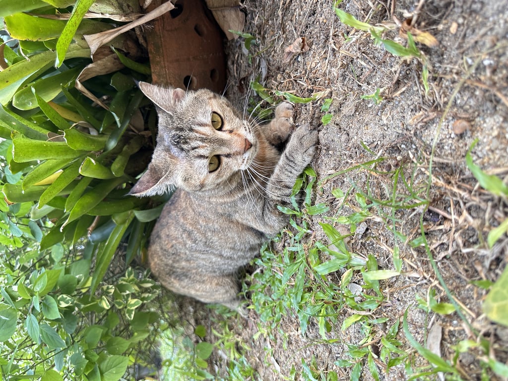 แมวสลิดสีน้ำตาล หางสีเทา ปลอกคอน้ำเงิน เป็นมิตรและไม่กลัวคน เชื่องมาก น่าจะเป็นแมวบ้านที่มีคนเลี้ยงดูมา ชอบมานั่งเล่นในสวน