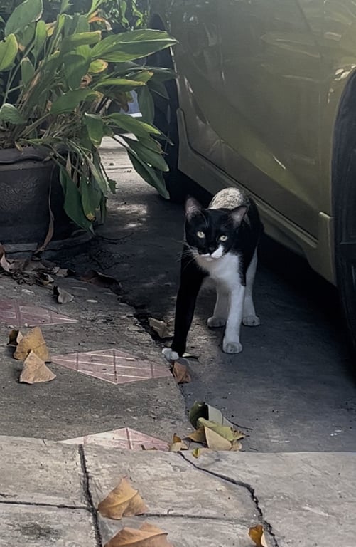 แมวสีดำขาว ไม่ทราบเพศ หน้าดำ บริเวณปากเป็นสีขาว ขาหน้าข้างขวาสีดำมีถุงเท้าขาว ขาซ้ายขาว